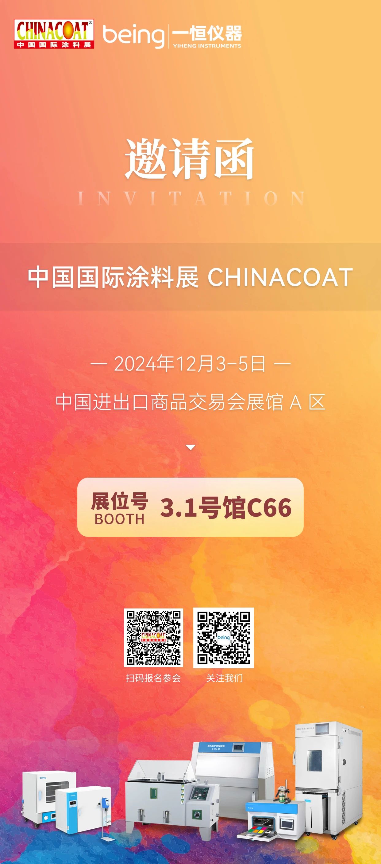 2024年12月3至5日,为期三天的CHINACOAT展览会,将重临广州,我们将携高低温交变湿热试验箱、氙灯耐候试验箱、紫外耐候试验箱、盐雾腐蚀试验箱、顶置搅拌器、分散机、磁力搅拌器、干燥箱和新型粘度计亮相3.1号馆C66展位,敬请莅临,交流合作。